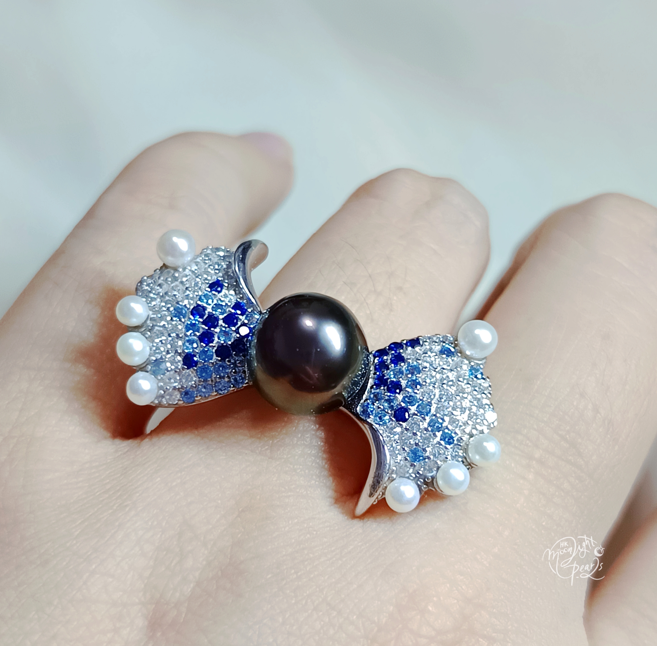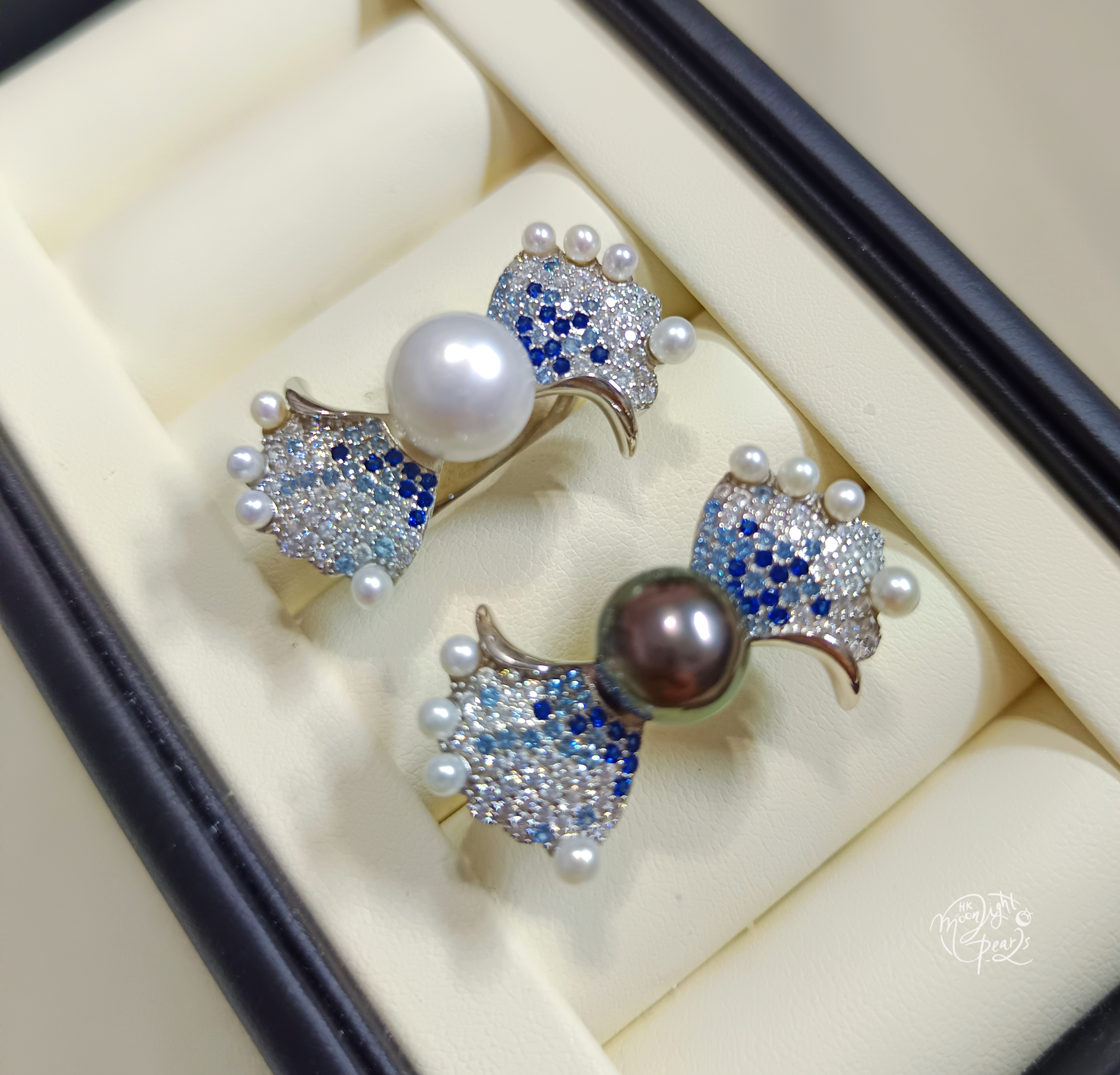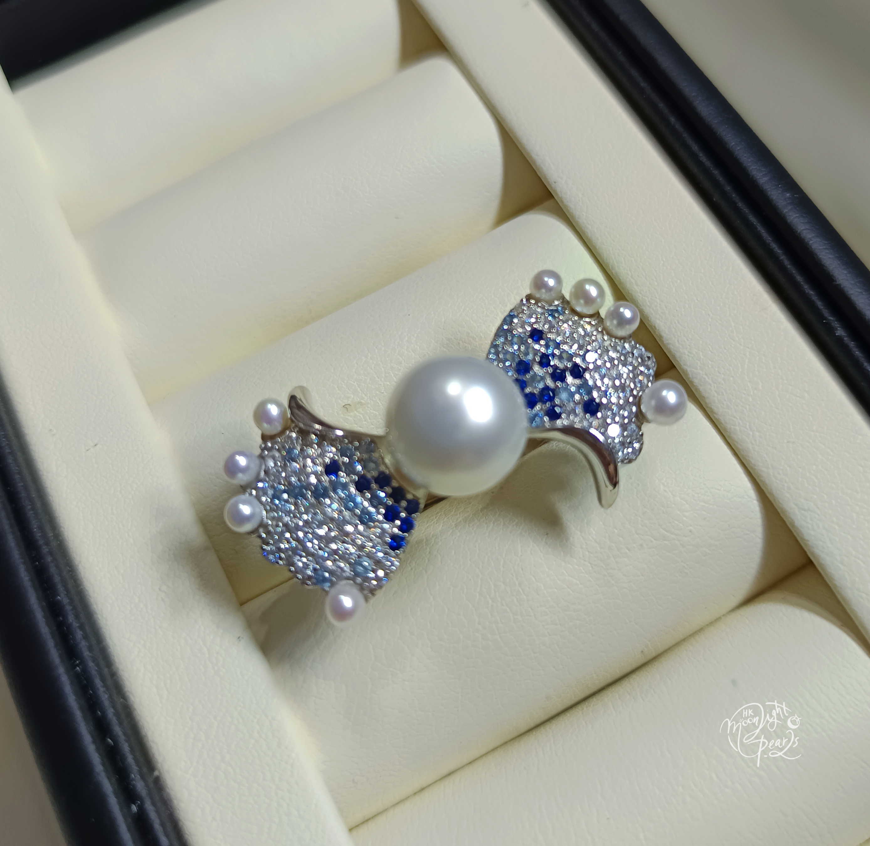 近正圓極強光澳白海水珍珠/大溪地海水珍珠精工s925銀微鑲藍鋯石海浪蝴蝶開口戒指