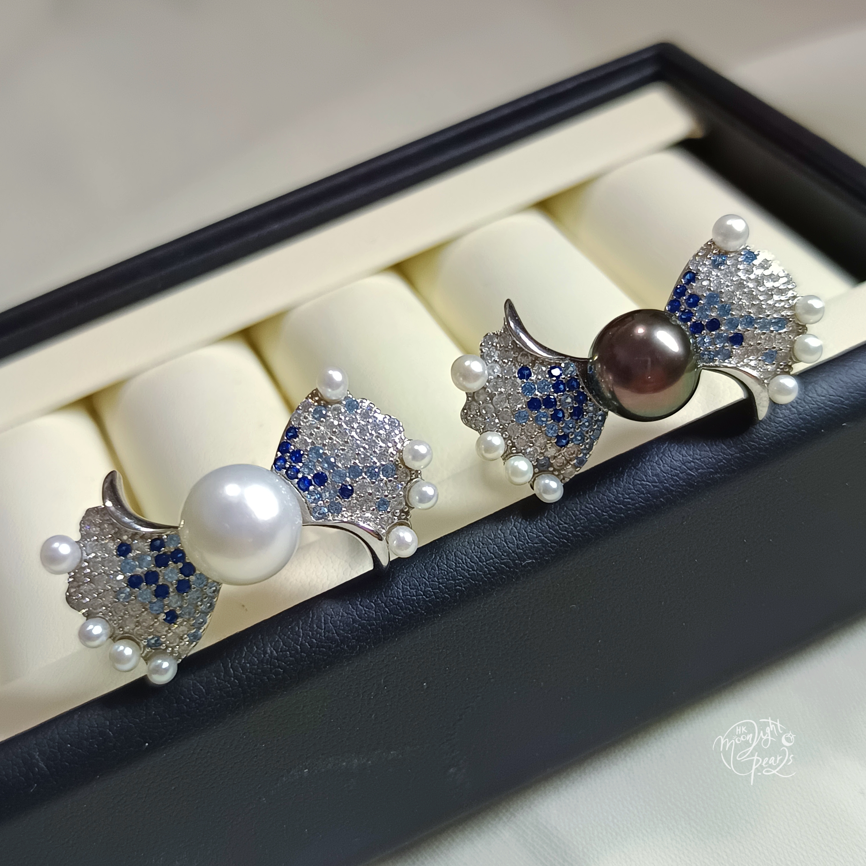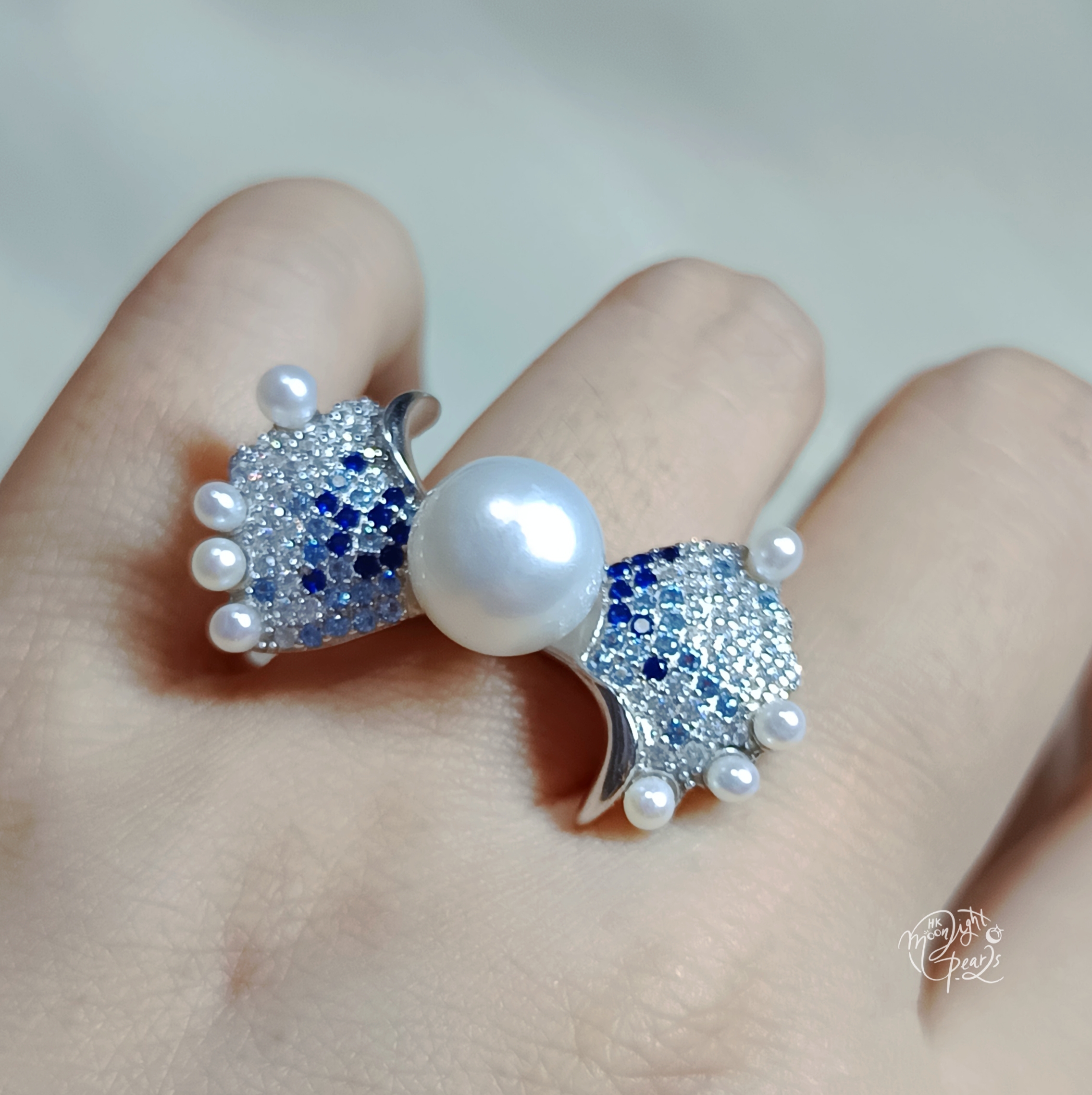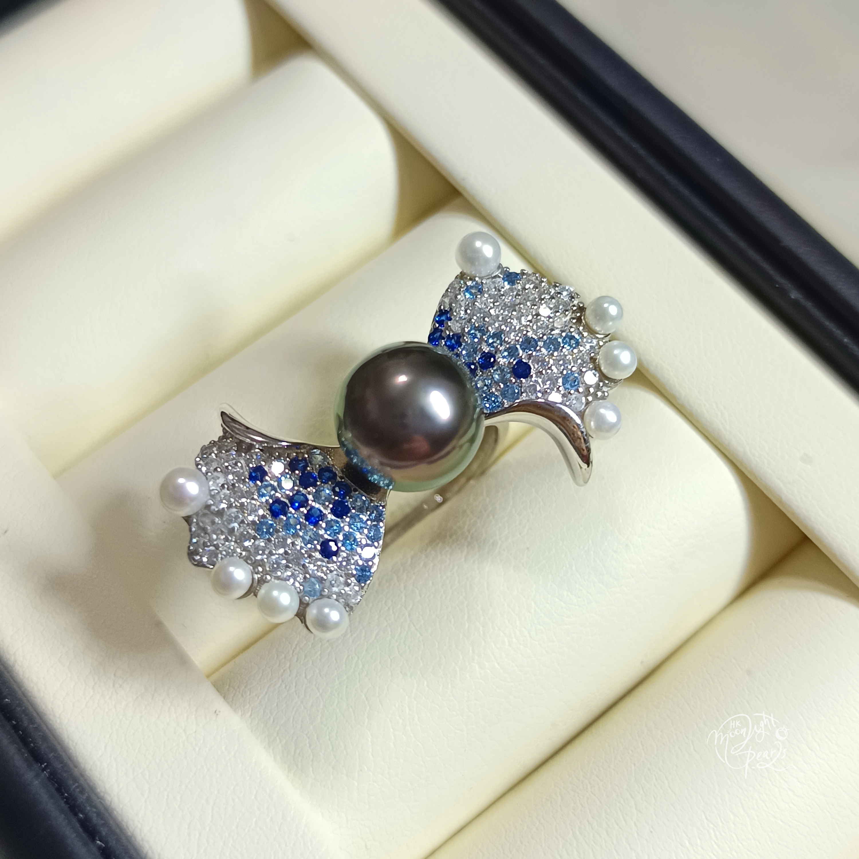 近正圓極強光澳白海水珍珠/大溪地海水珍珠精工s925銀微鑲藍鋯石海浪蝴蝶開口戒指