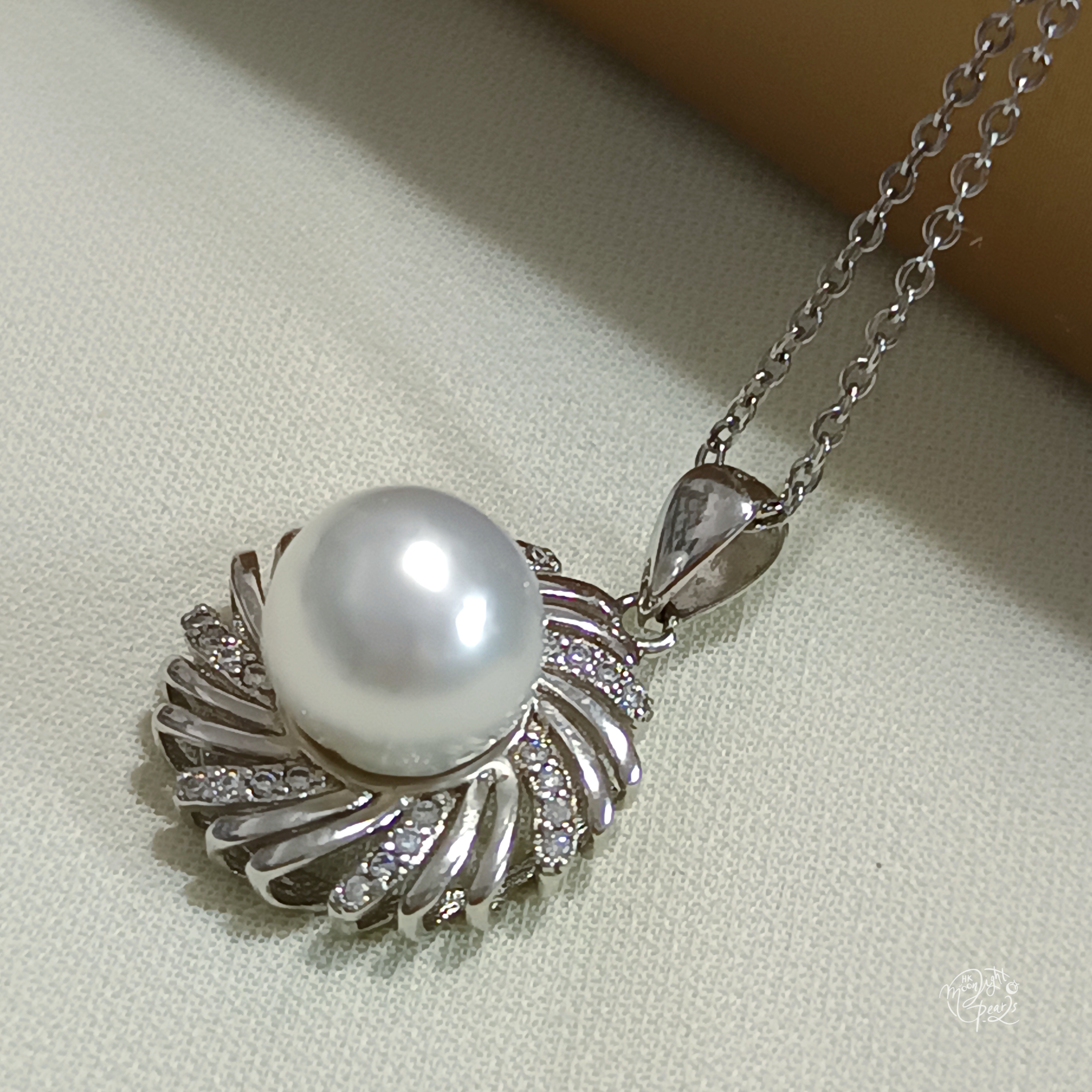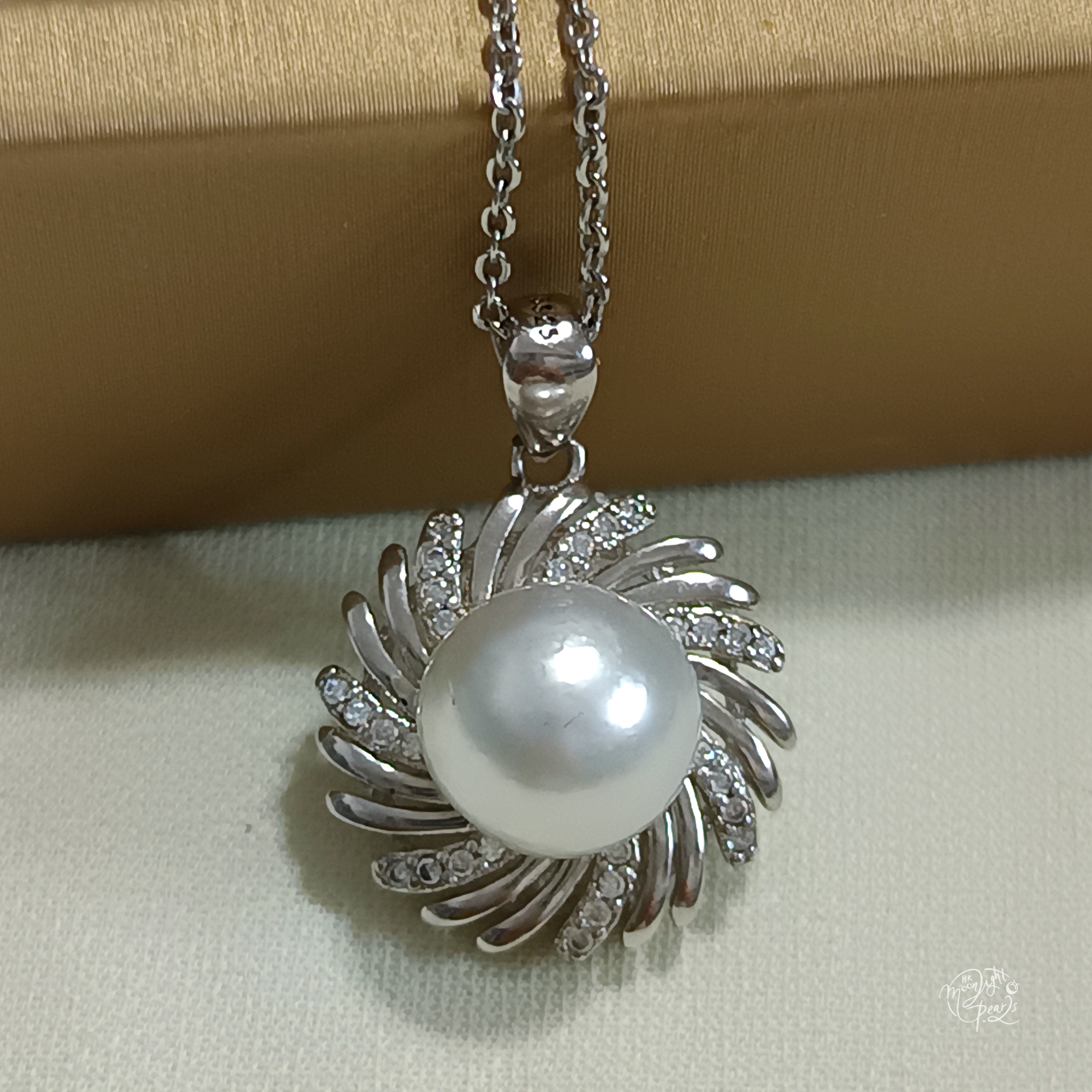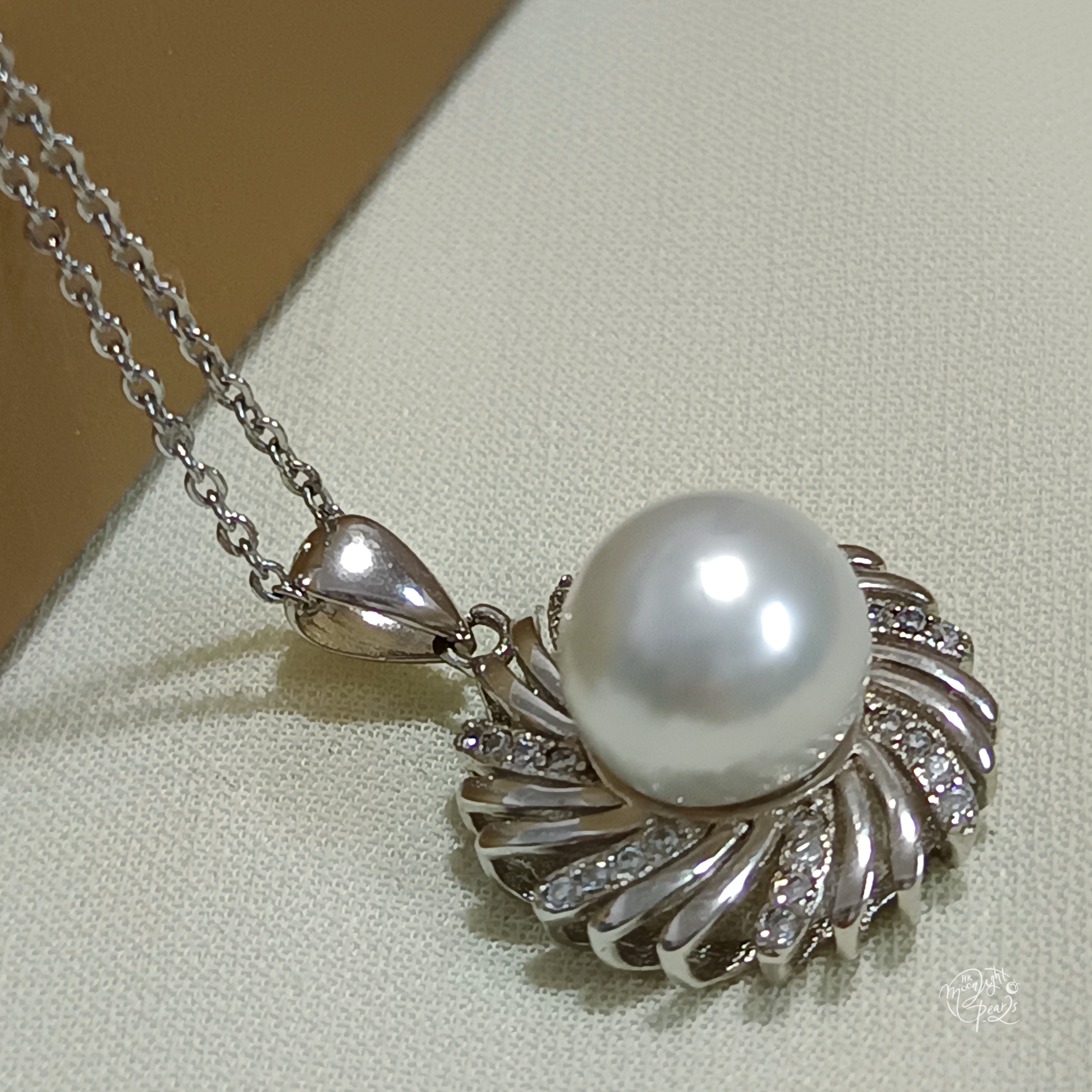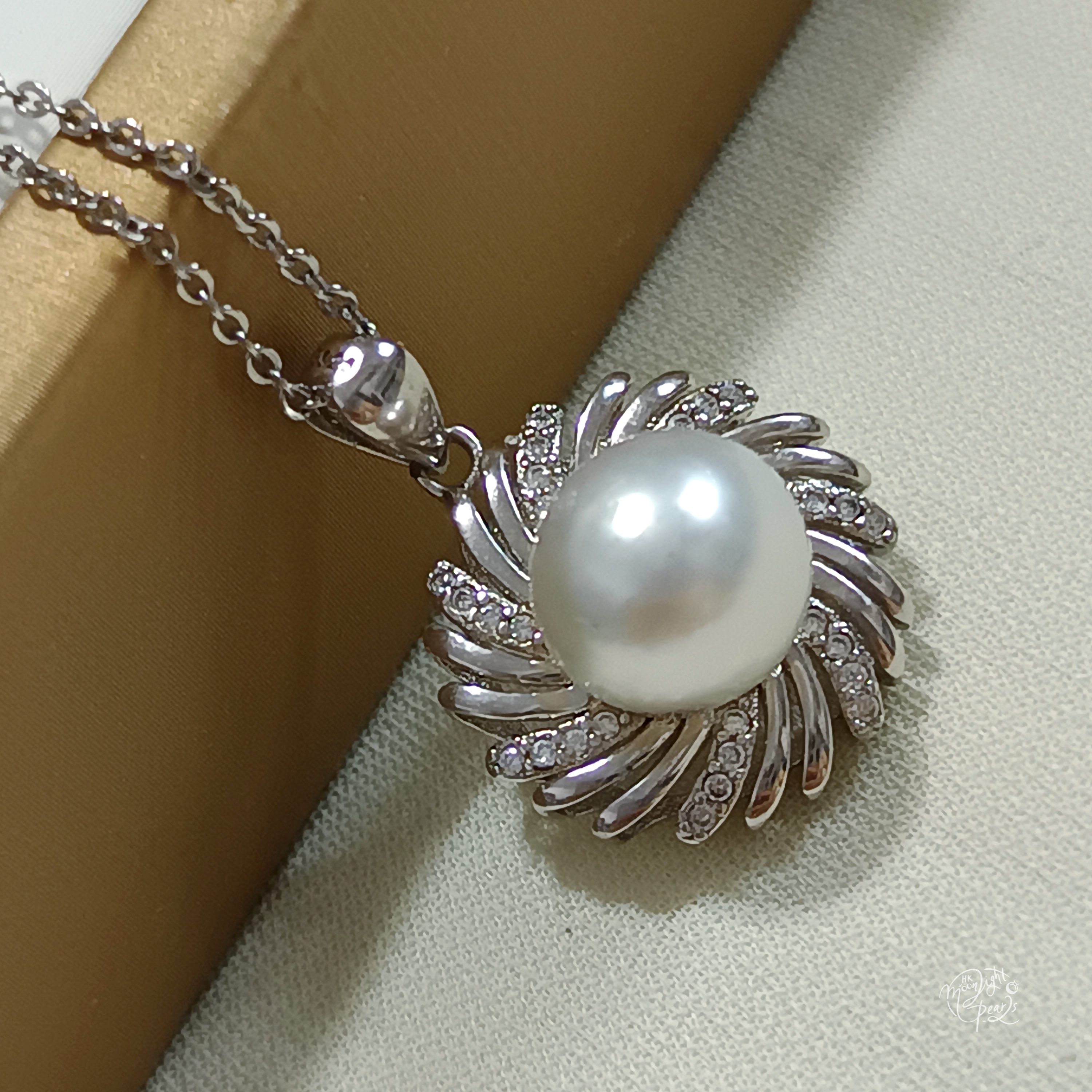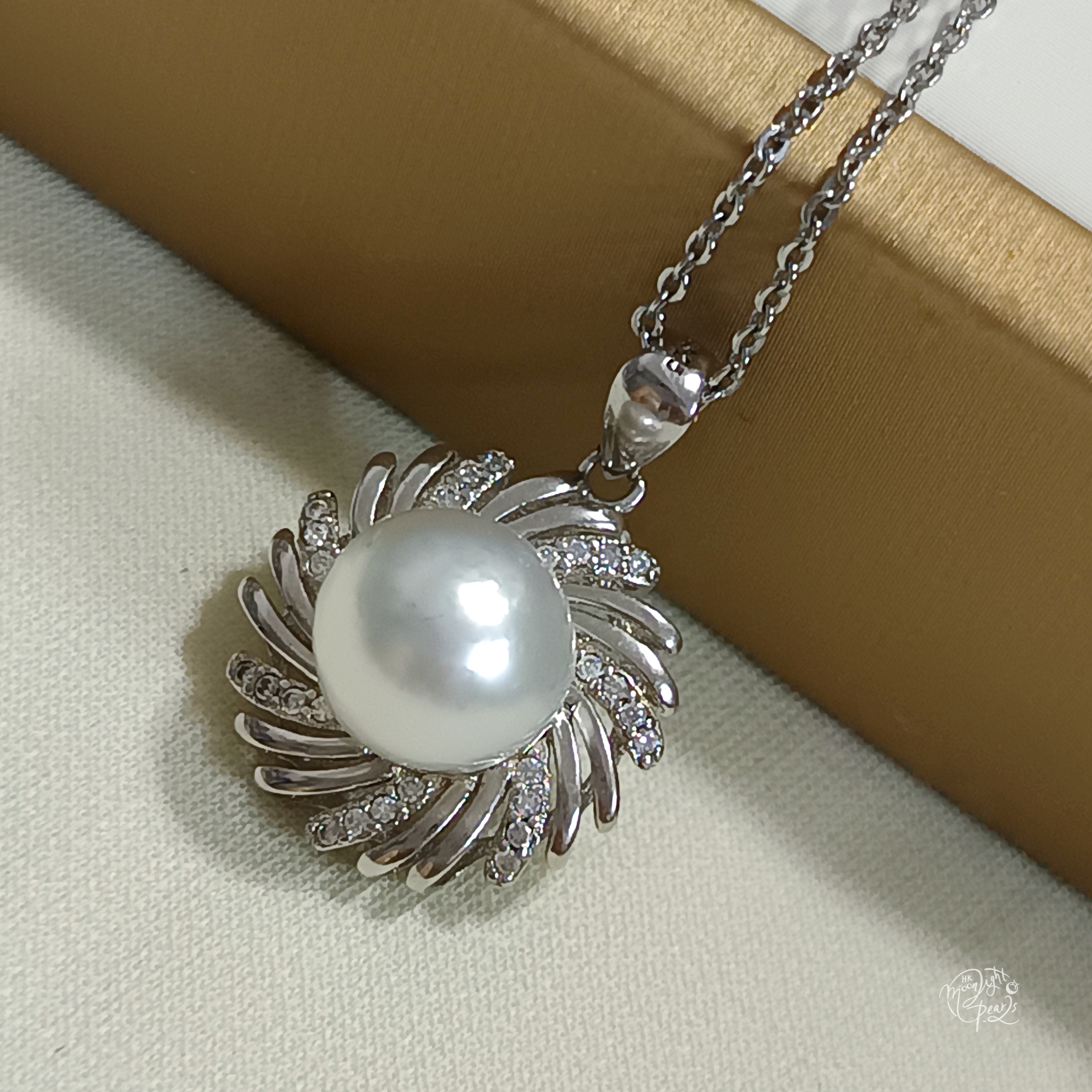 近正圓銀白冷光澳白海水珍珠精工s925銀微鑲鋯石吊墜(送注白金鍊)