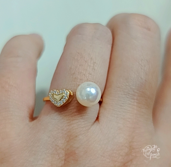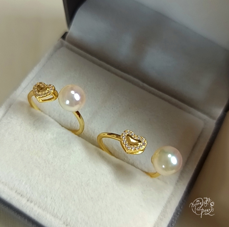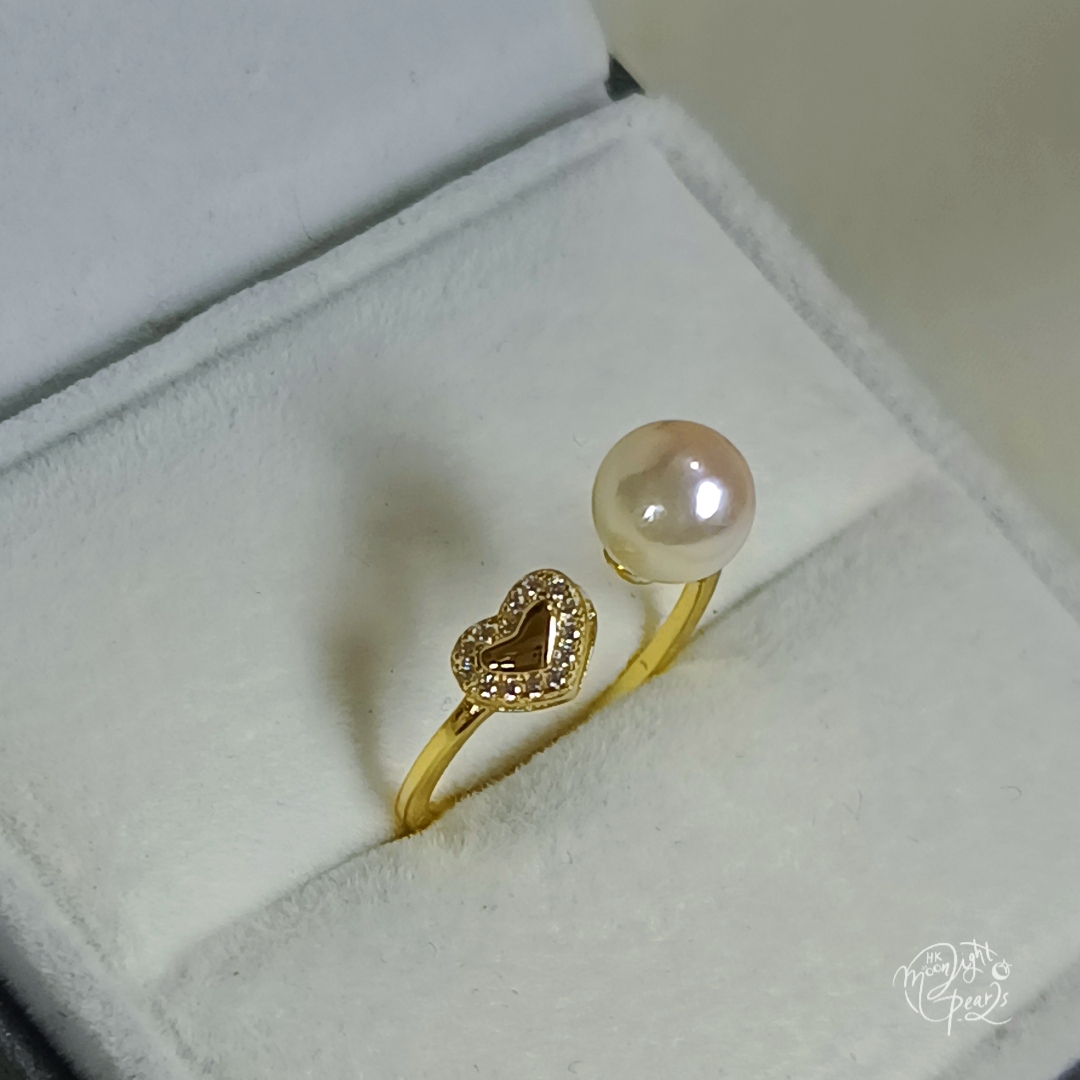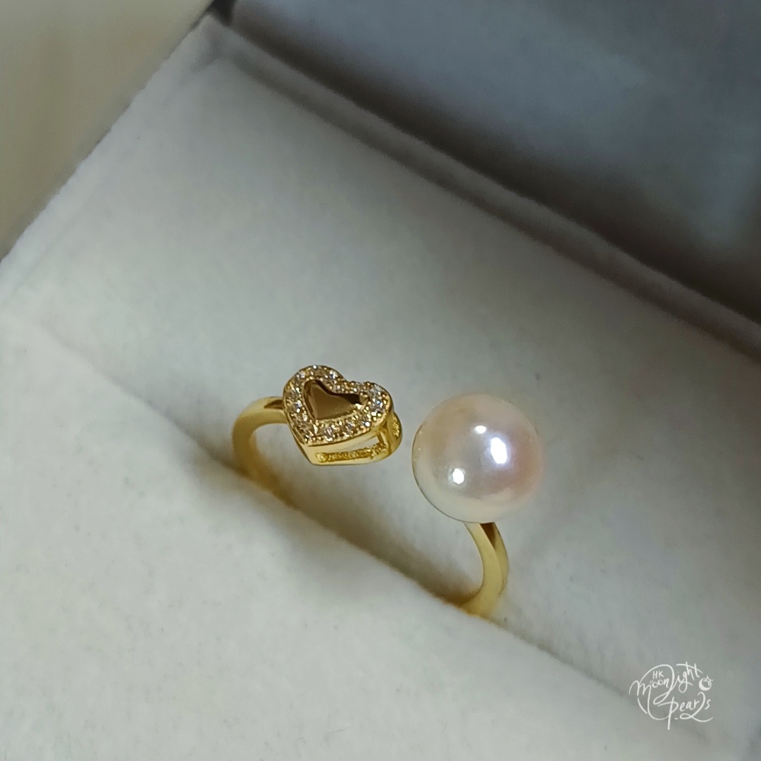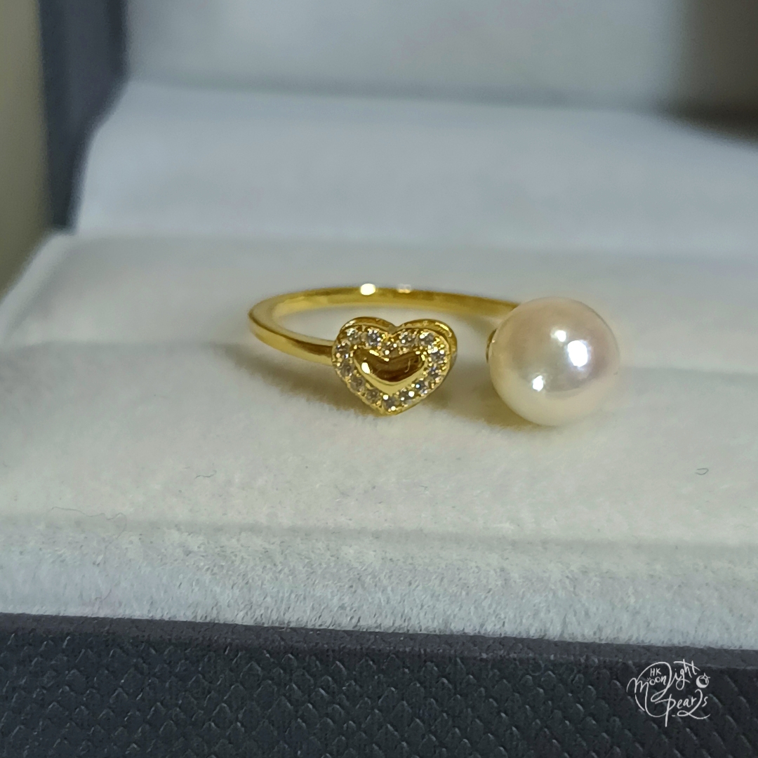 通體s925銀材質正圓極強光日本akoya 羽皇金海水珍珠微鑲鋯石愛心開口戒指