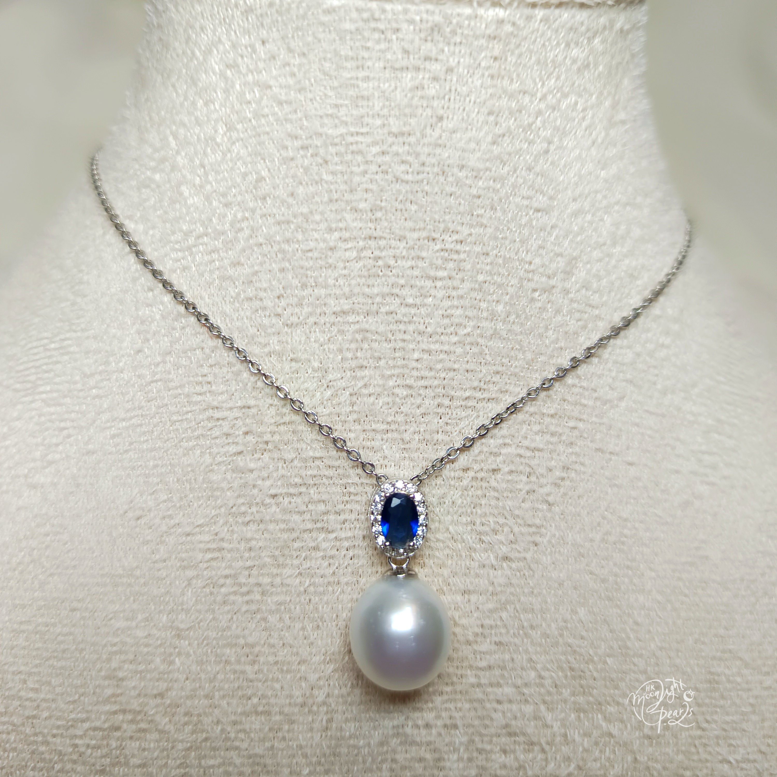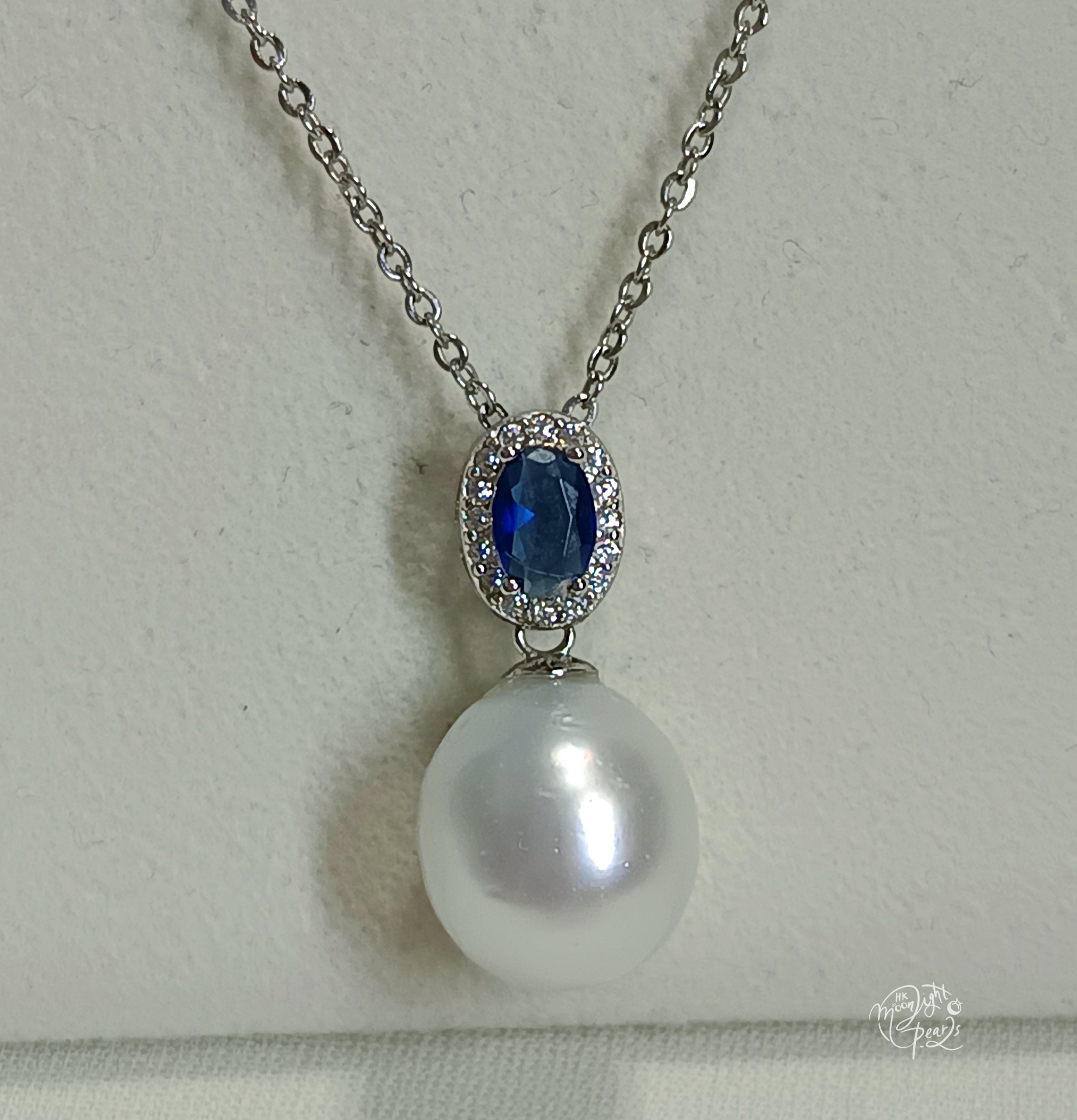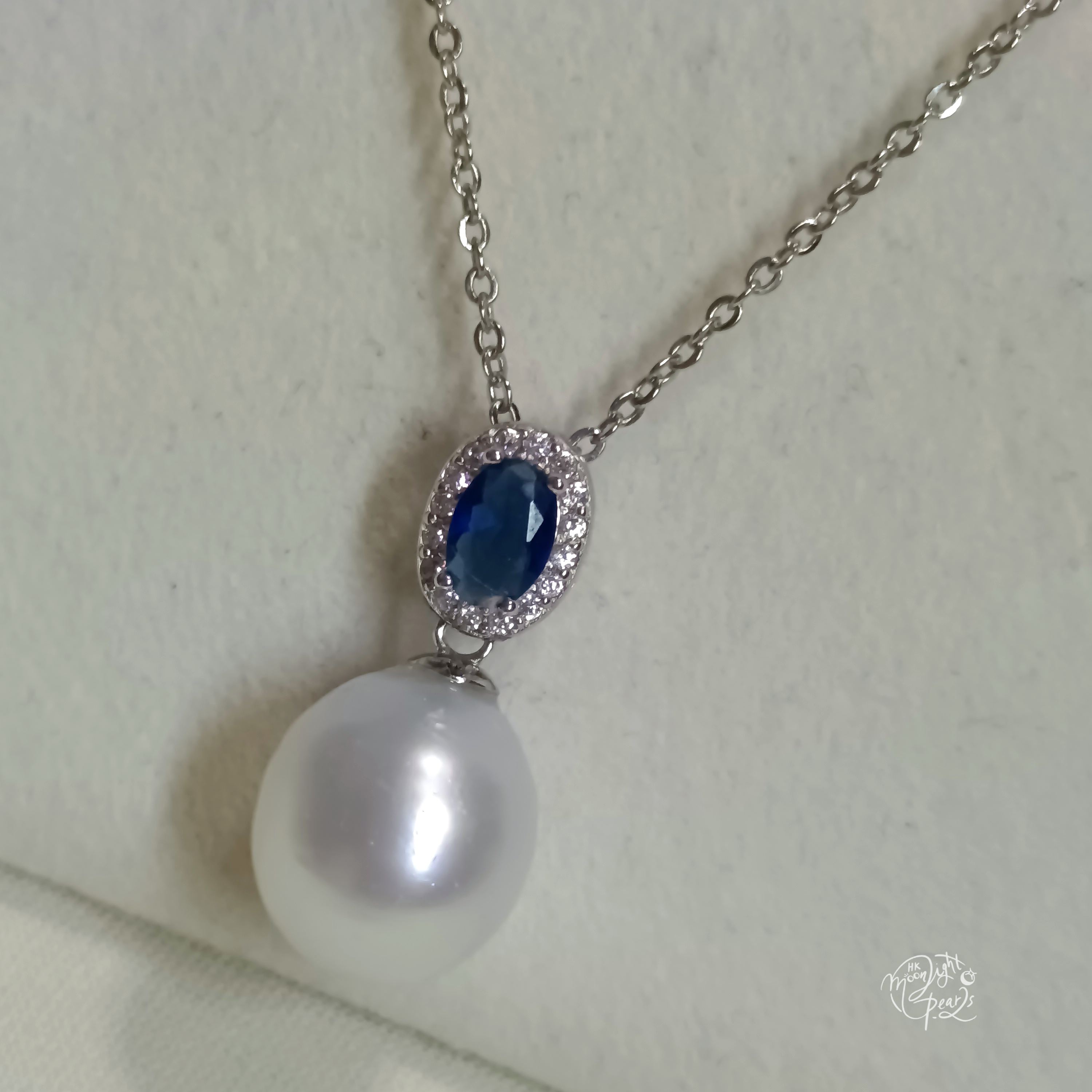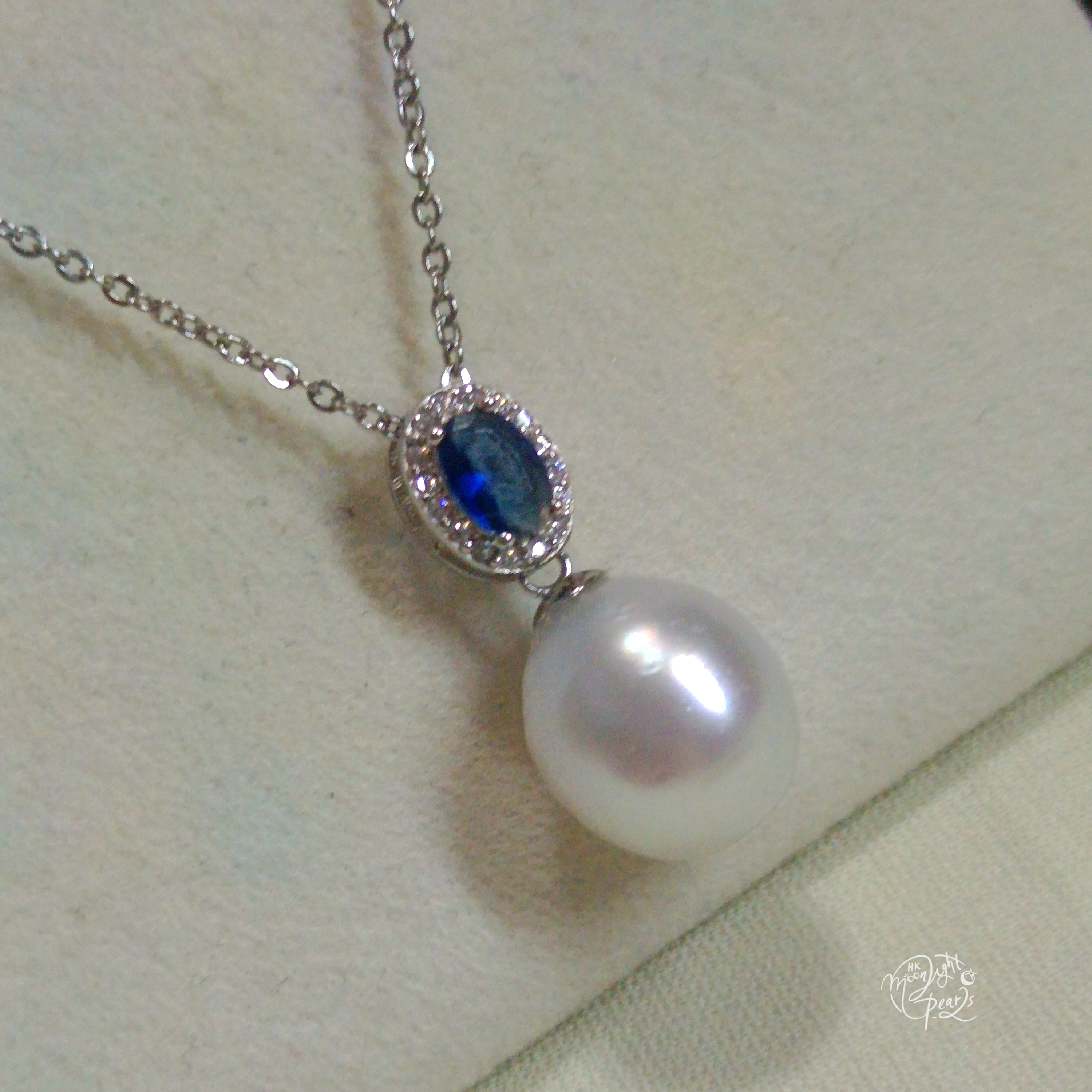 鵝蛋形極強銀白冷光澳白海水珍珠精工s925銀高鑲藍鋯石吊墜(送注白金鍊)