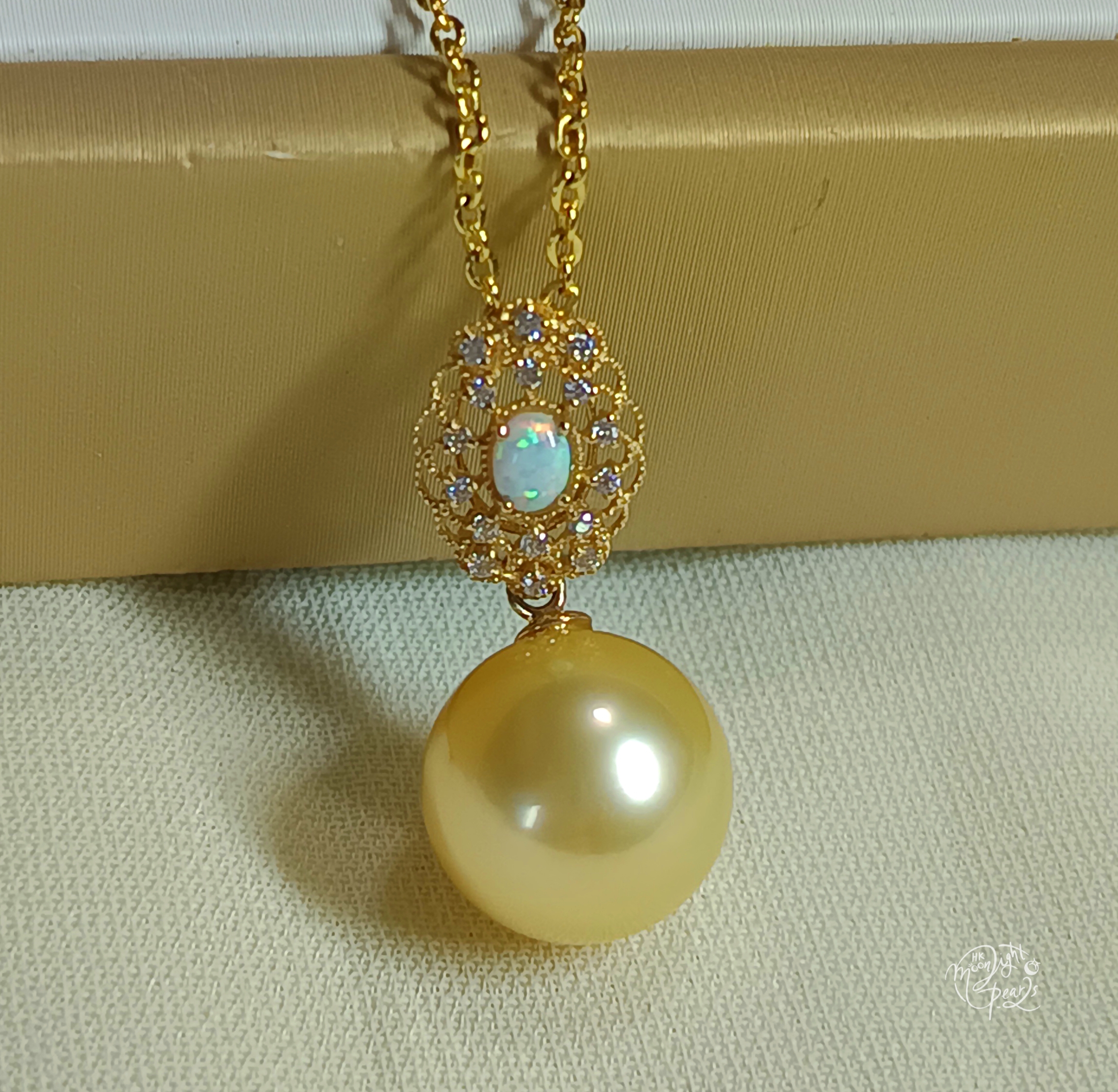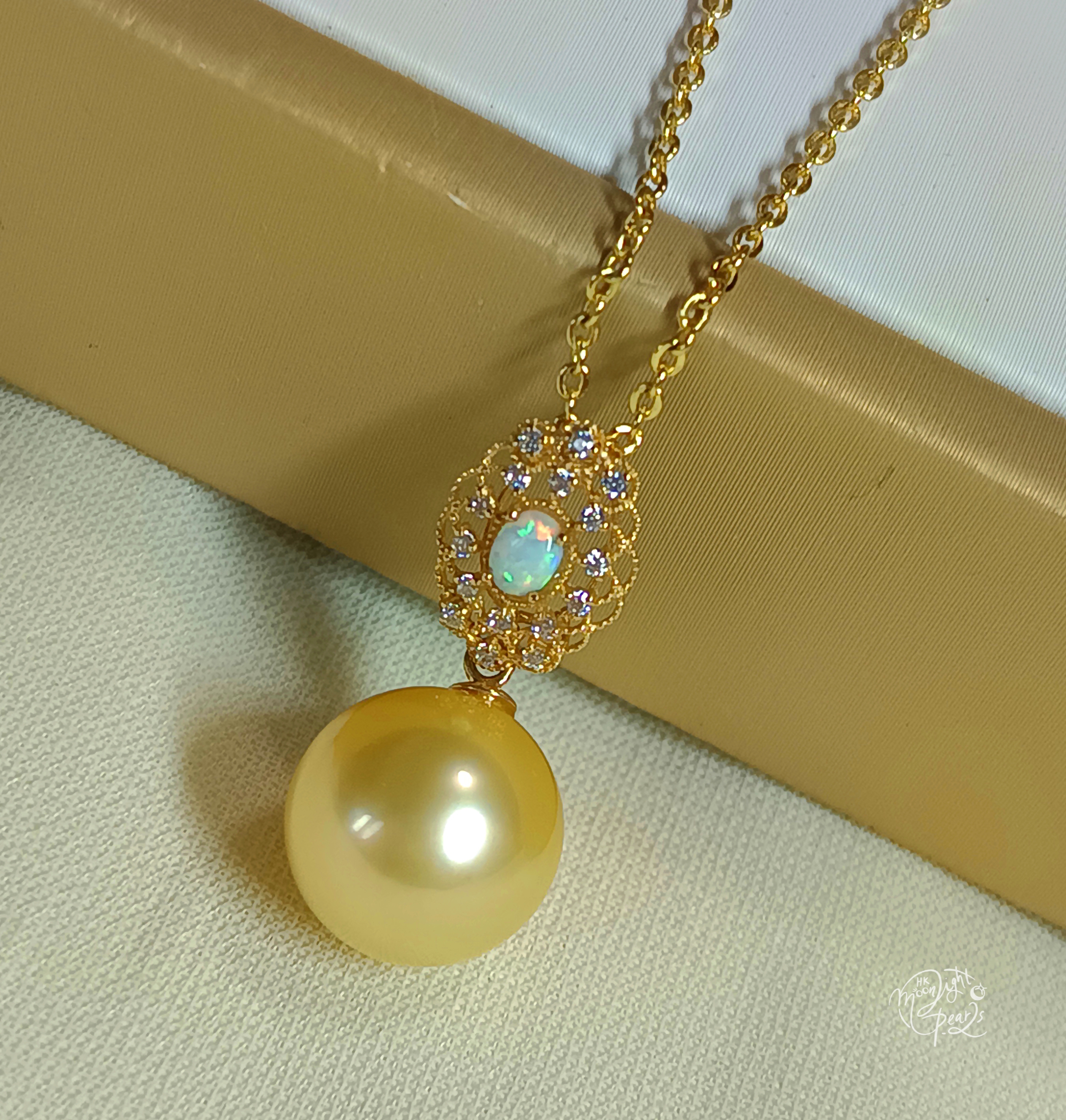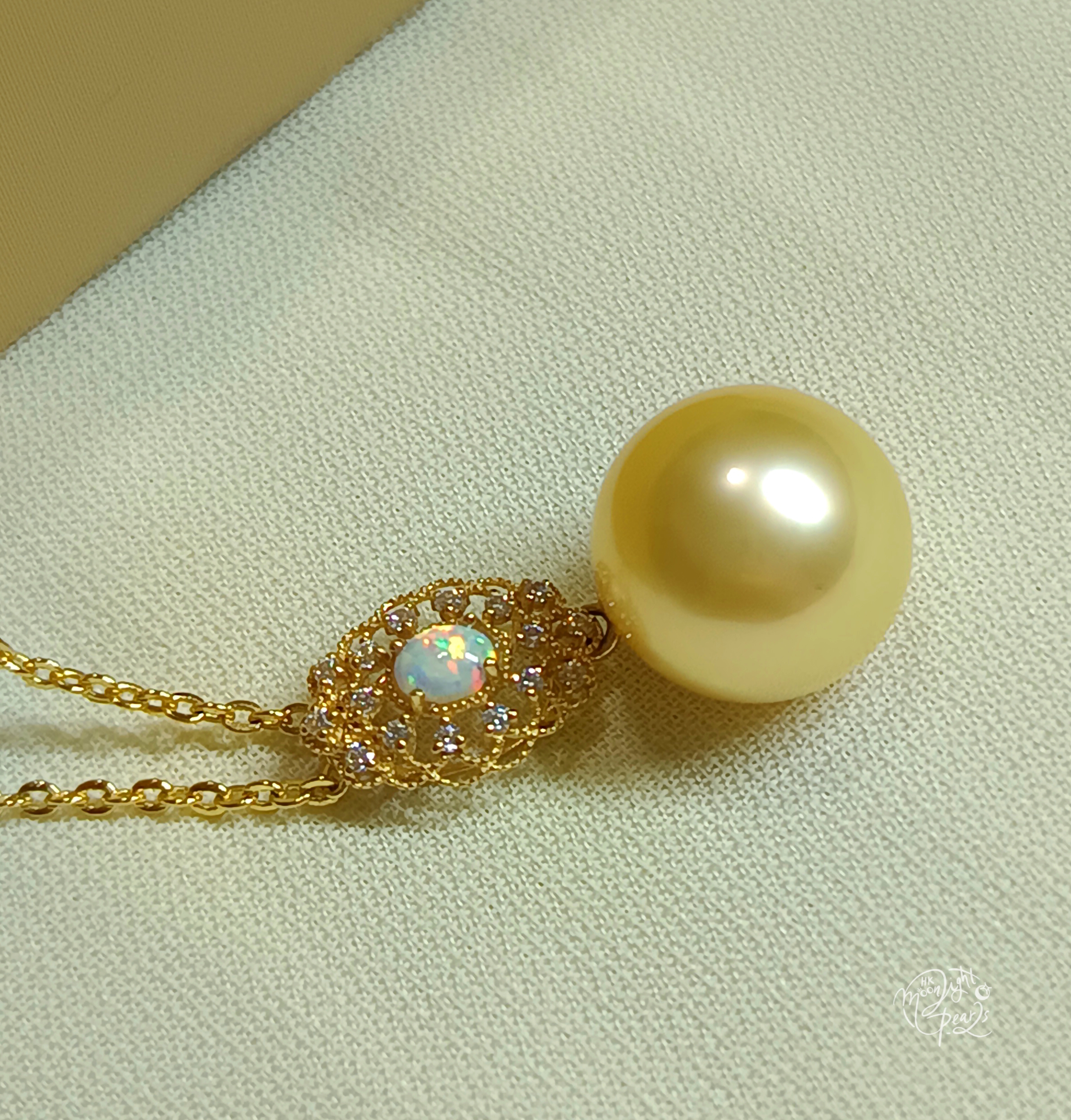 14k金鑲鋯石/歐泊正圓極強光南洋金海水珍珠吊墜(送注金鍊)