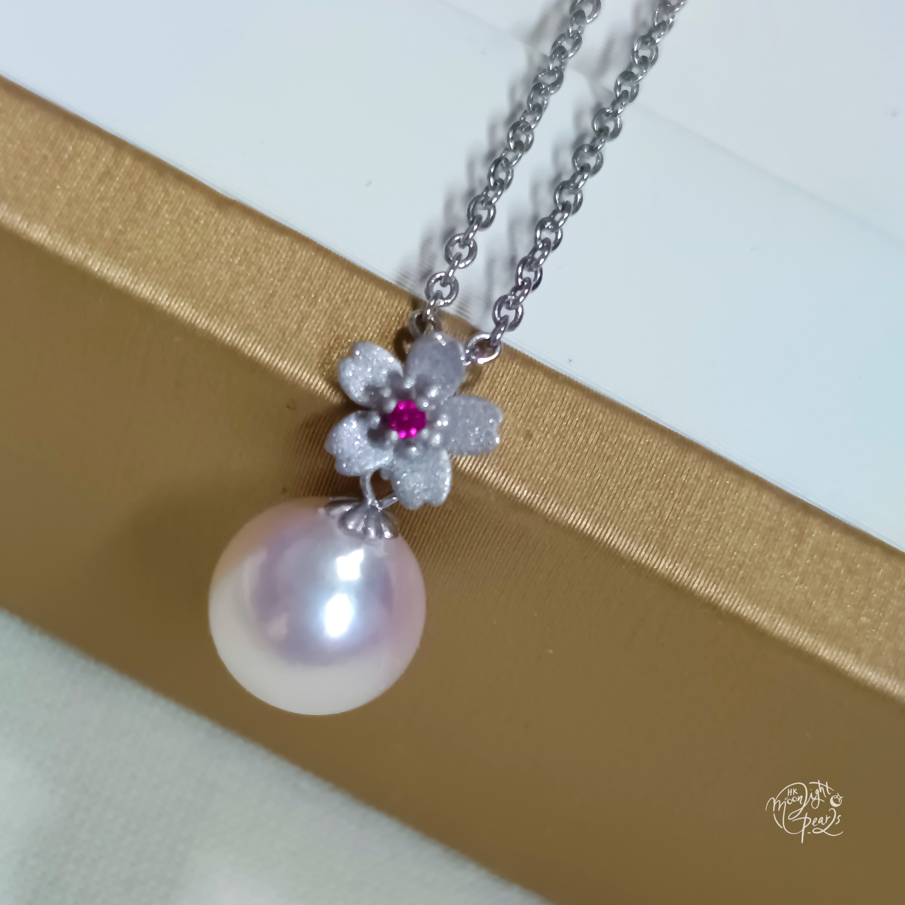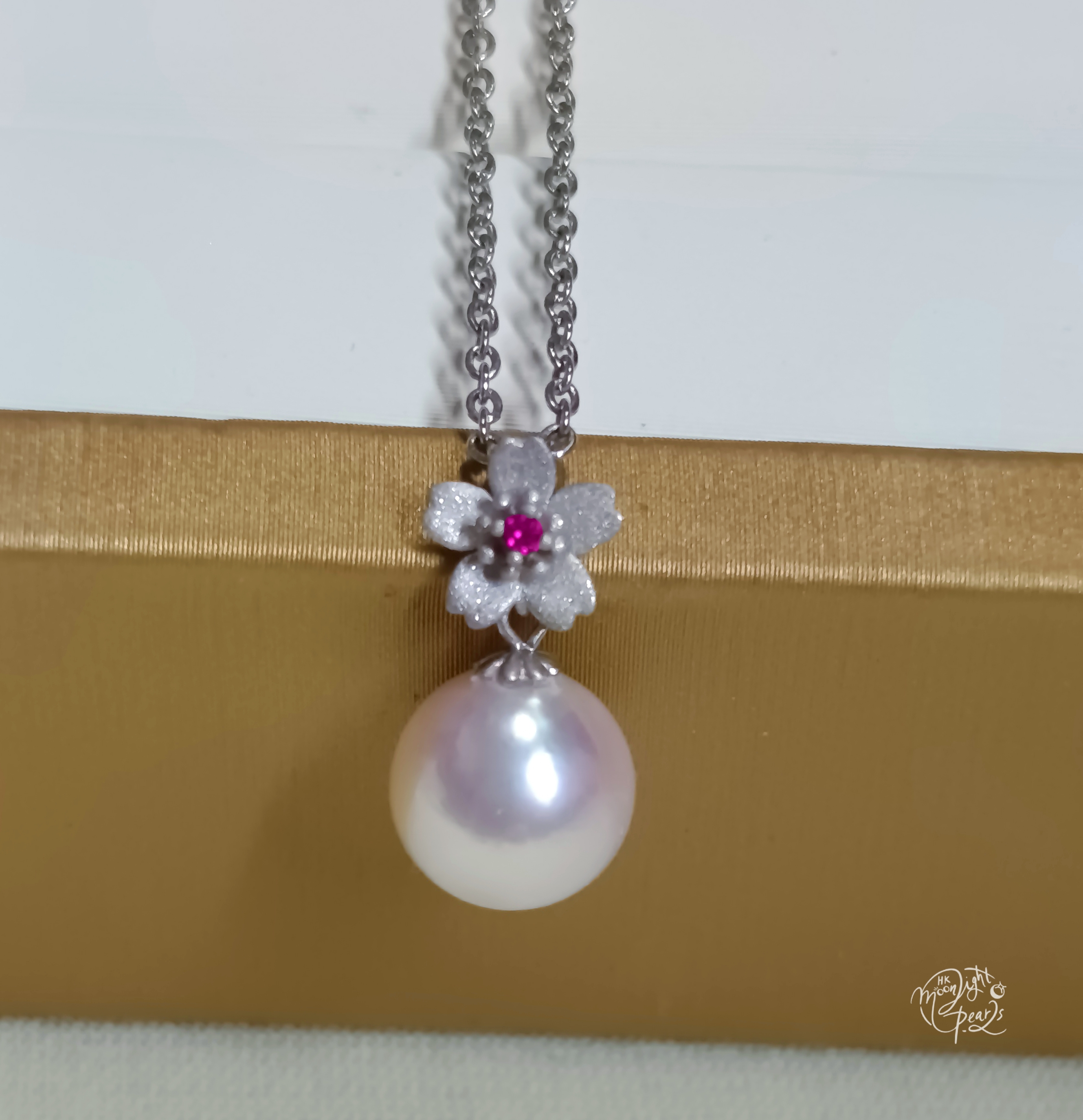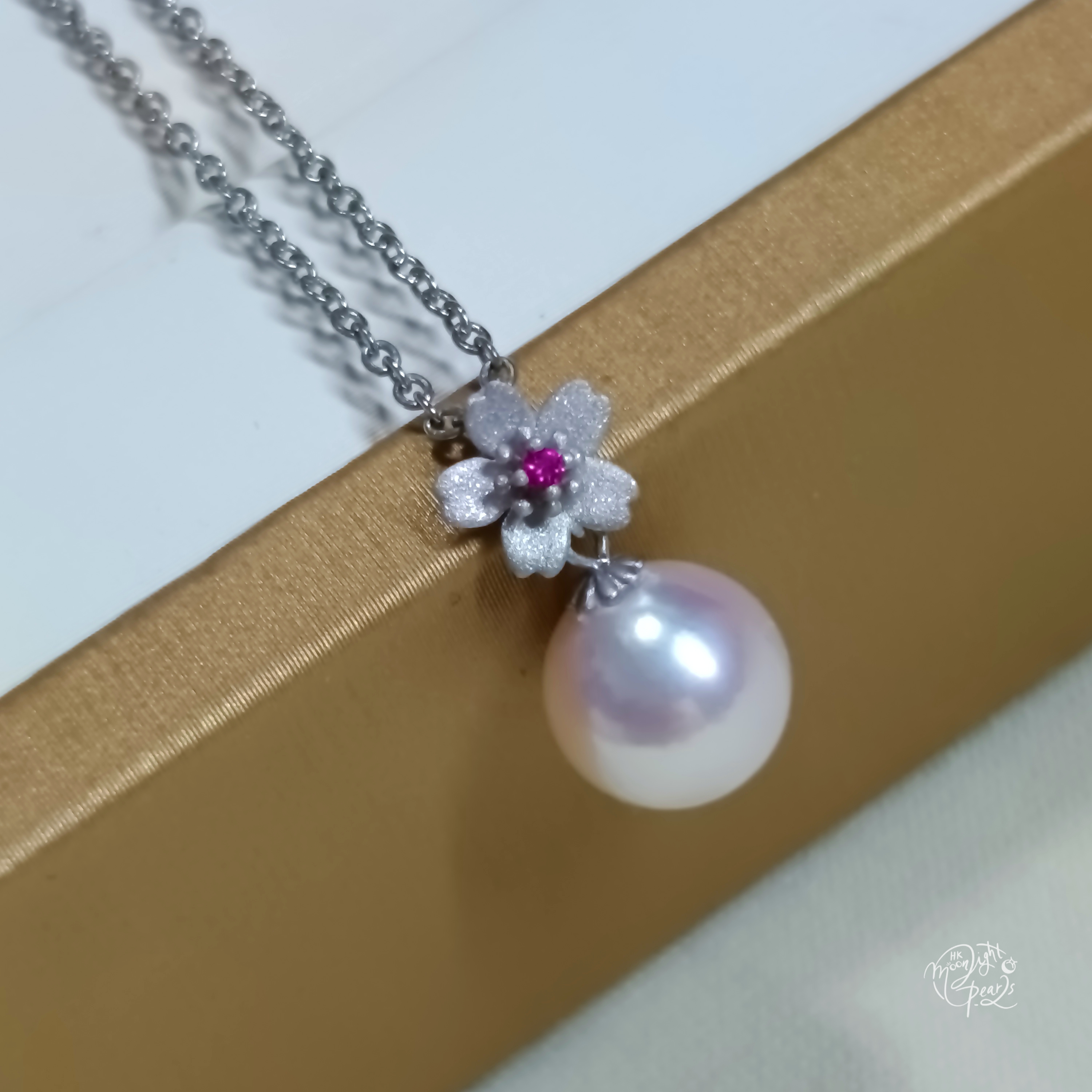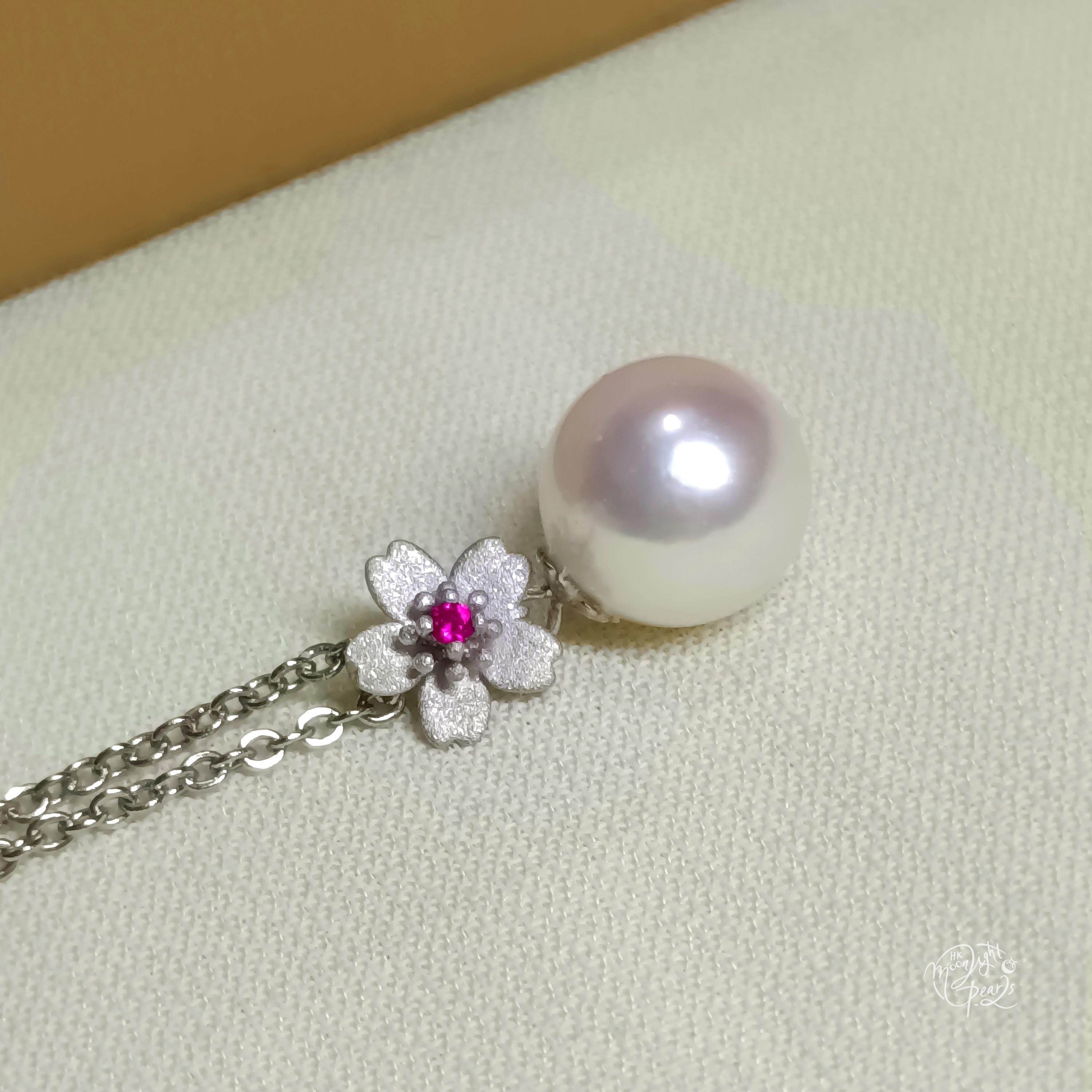 18k白金+紅寶石正圓極強光日本akoya 櫻花粉海水珍珠磨砂工藝五瓣花吊墜(送銀鍊)