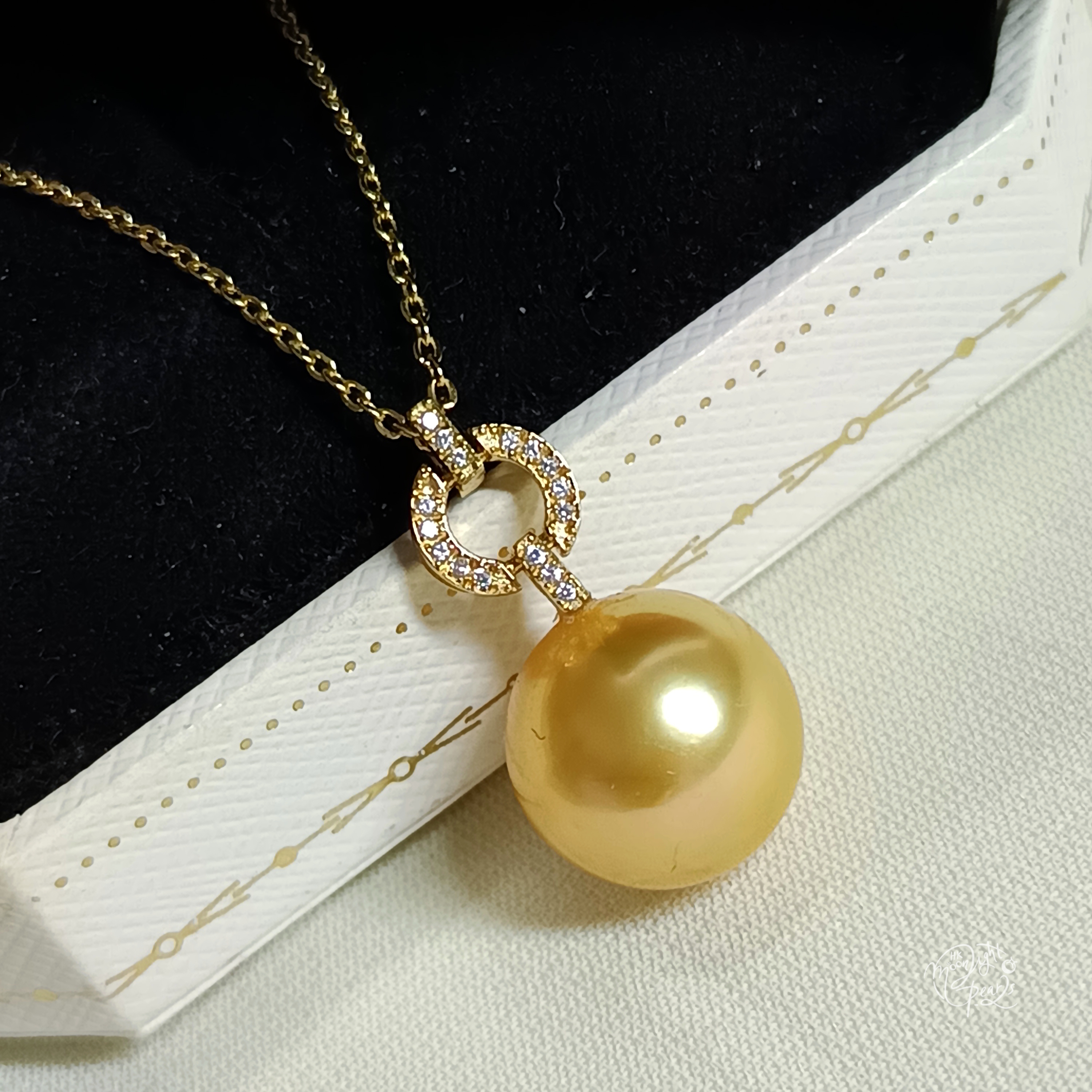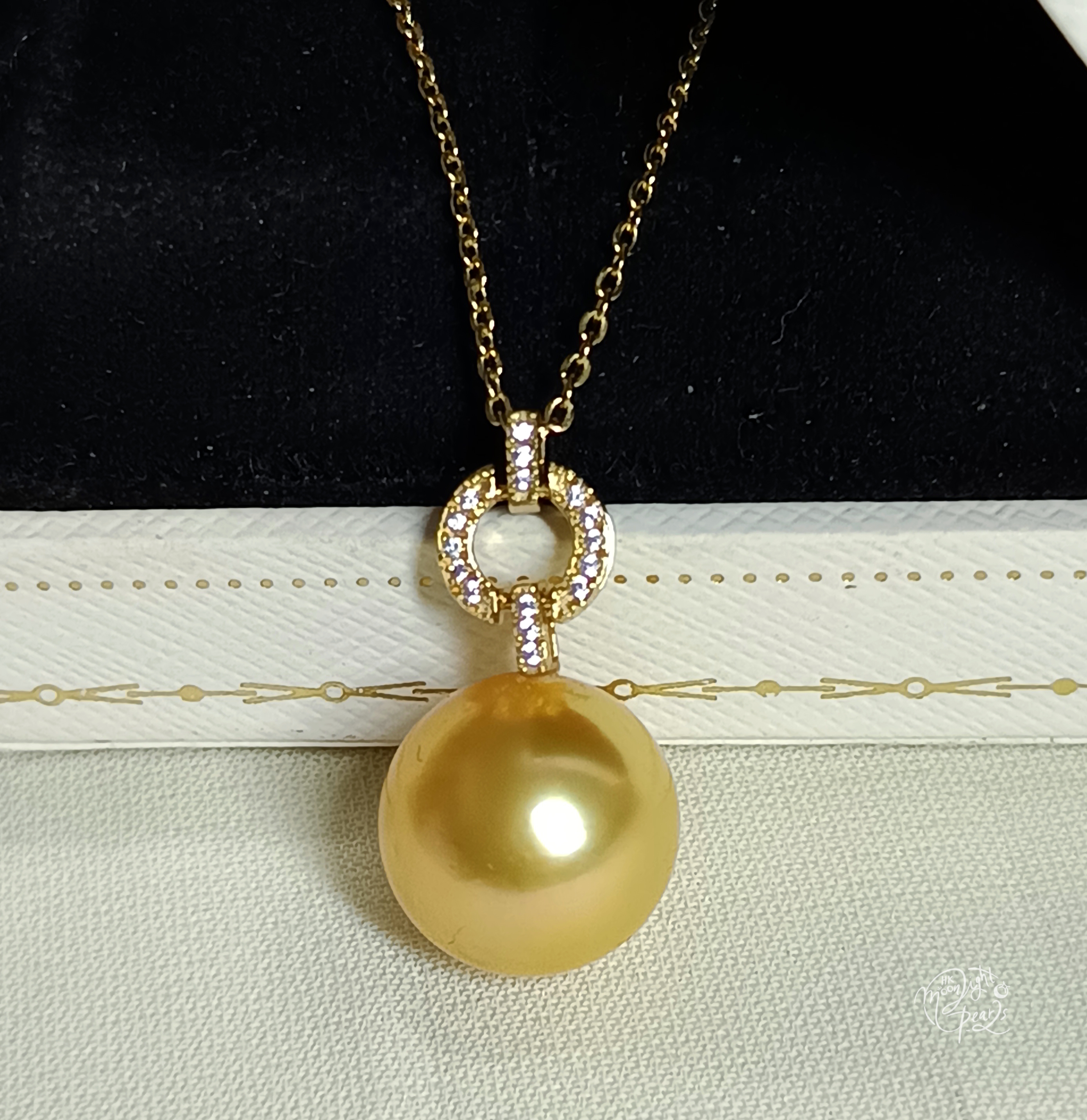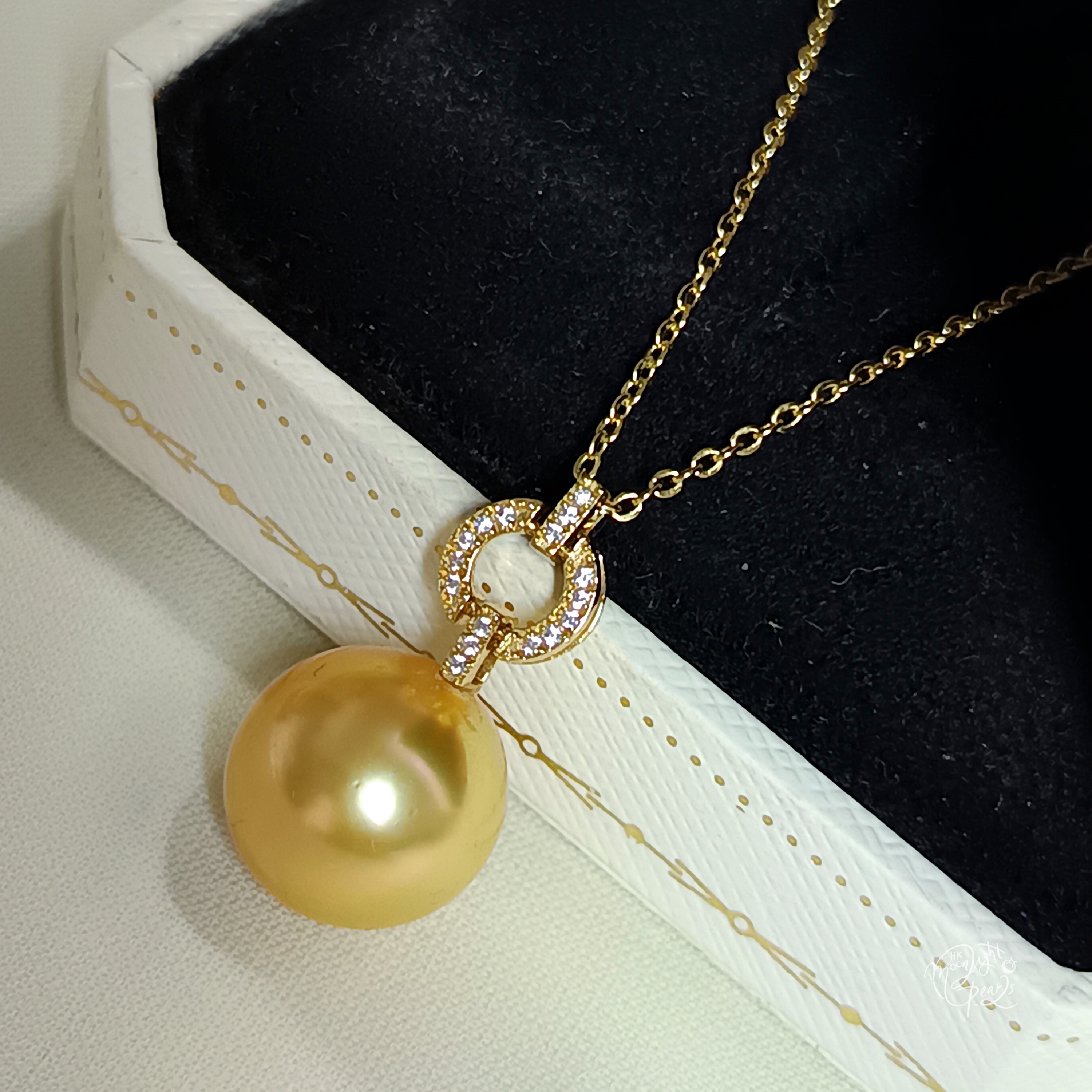 18k金鑲鋯石卡地亞款正圓極強光南洋濃金海水珍珠吊墜(送注金鍊)